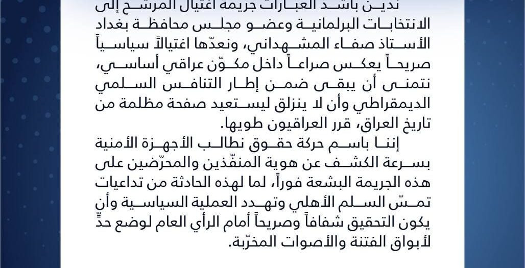 ندين بأشد العبارات جريمة اغتيال المرشح إلى الانتخابات البرلمانية وعضو مجلس محافظة بغداد الأستاذ صفاء …