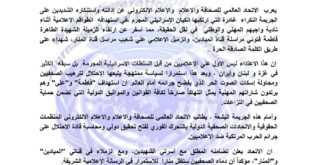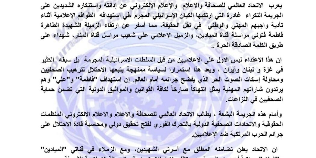الاتحاد العالمي للصحافة يدين استهداف الاحتلال لطواقم “الميادين” و”المنار” ويطالب بتحقيق دولي أدان الاتحاد العالمي …