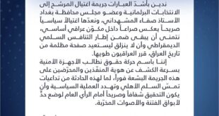 تحالف العزم يستنكر اغتيال المشهداني: اعتداء آثم يمثل تصعيداً خطيراً يمسّ أمن الدولة